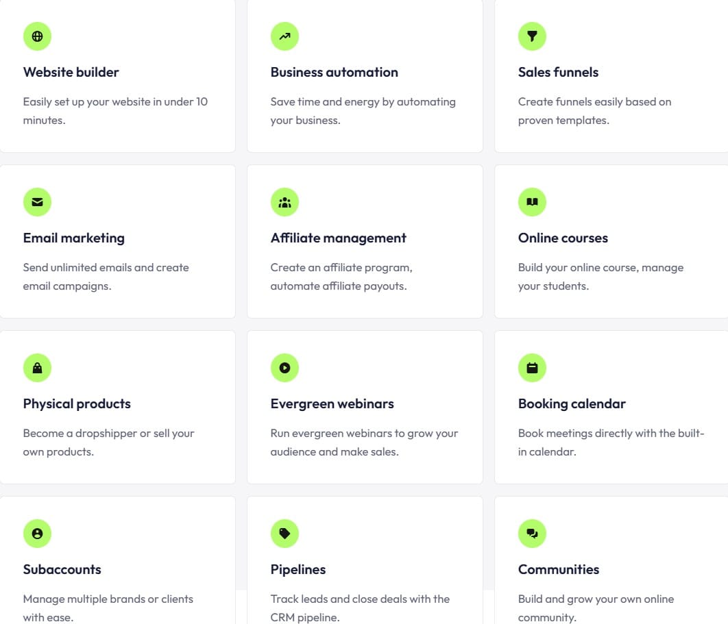 We are an all-in-one platform that replaces the separate tools most online entrepreneurs use to run their business. Instead of paying for ClickFunnels for funnels, Mailchimp for email, Teachable for courses, Calendly for bookings, and a separate affiliate platform, you get all of it in one place, starting at $0. Over 500,000 entrepreneurs use our system to build sales funnels, send automated email campaigns, host online courses, manage affiliate programs, and sell digital and physical products from a single dashboard. The free plan includes 2,000 contacts, unlimited emails, and your first funnel at no cost, with no credit card required.